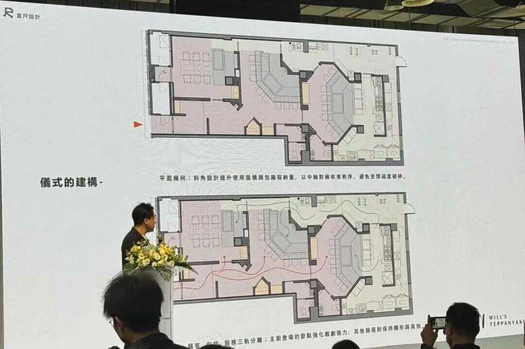 在做一个铁板烧餐厅案例时,他没有过多强调动线有多高效,或者翻台率如何提升。他花了大量篇幅讲那个入口的走廊。