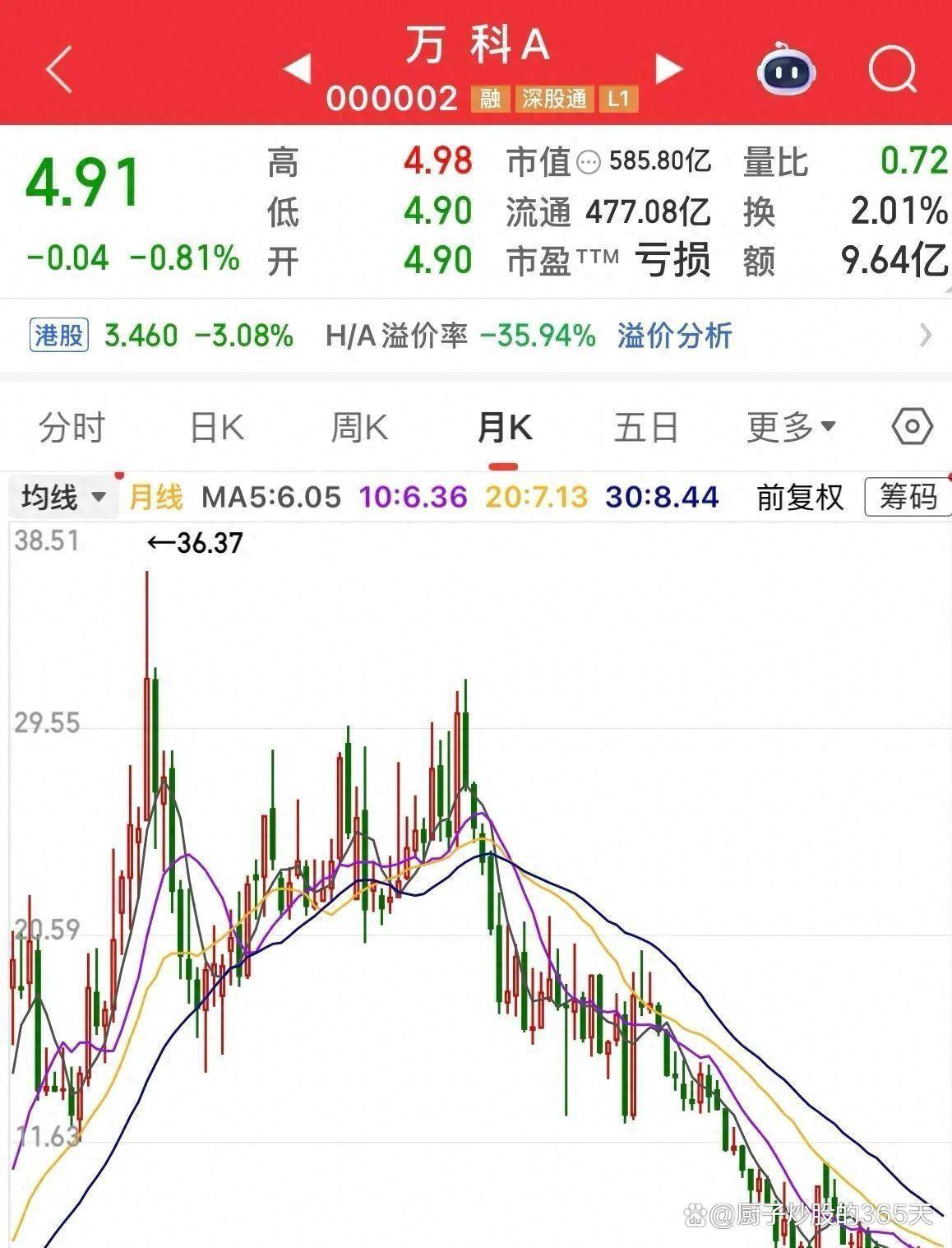 截至12月初,万科A股股价已跌至4.97元,较2018年历史高点的36元下跌了86.5%,市值从4300多亿元蒸发至仅约600亿元。 49.3万名股东中,一半以上的持股成本超过15元,他们几乎全部被套牢在这条长达七年的下行曲线中。