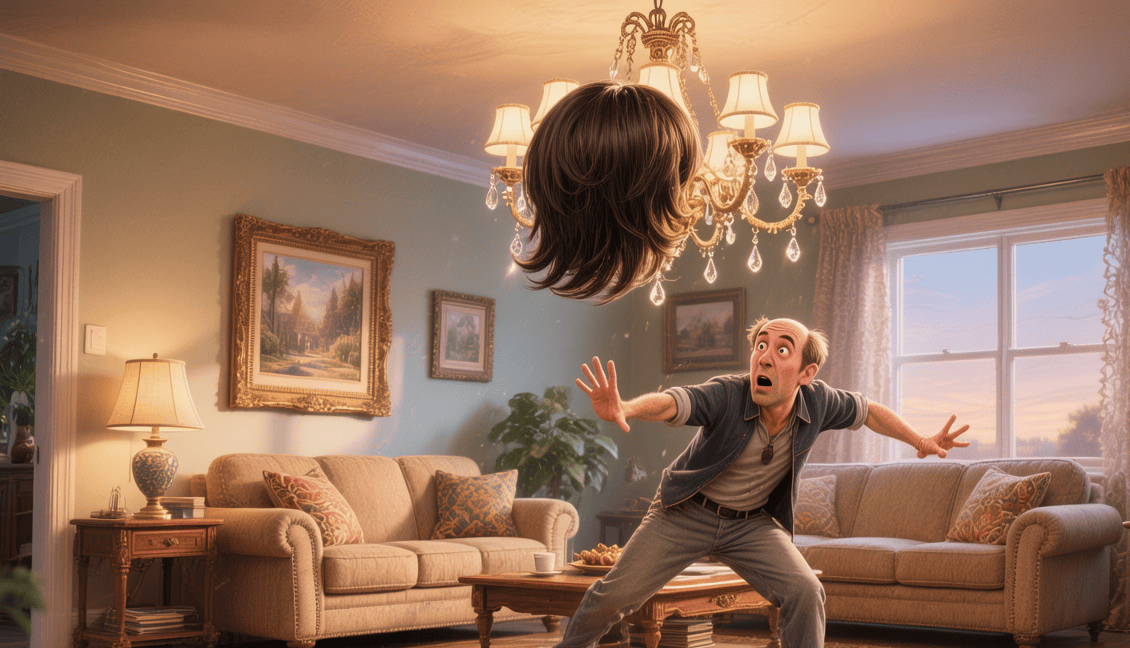 周末家庭聚会,小李秀新学的街舞,一个狂野甩头动作,假发直接飞向水晶吊灯。吊灯上的装饰品被砸得叮当响,像在抗议这场入侵。亲戚们先是目瞪口呆,随后爆笑如雷,三岁小侄女指着吊灯喊“ UFO 来了”。小李尴尬地搬椅子取假发,却把吊灯摇成了迪斯科球,全家即兴开起灯光派对。