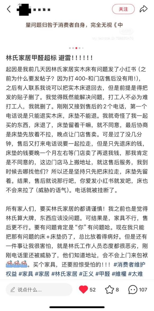 而在社交平台上,不少用户反馈林氏家居产品气味较大,有些甚至放置半年后仍有味道,这些反馈并非孤例,意味着林氏家居仍需进一步提升品控能力。