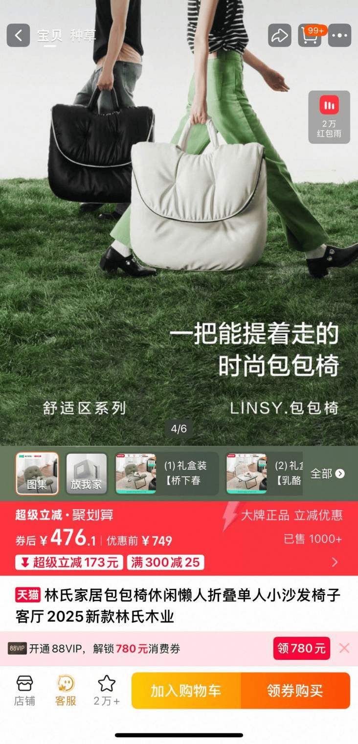 不过在天猫旗舰店,这款所谓爆款包包椅的券后价为476元,销量仅超1000+,且北京某林氏家居门店并未陈列该款产品。