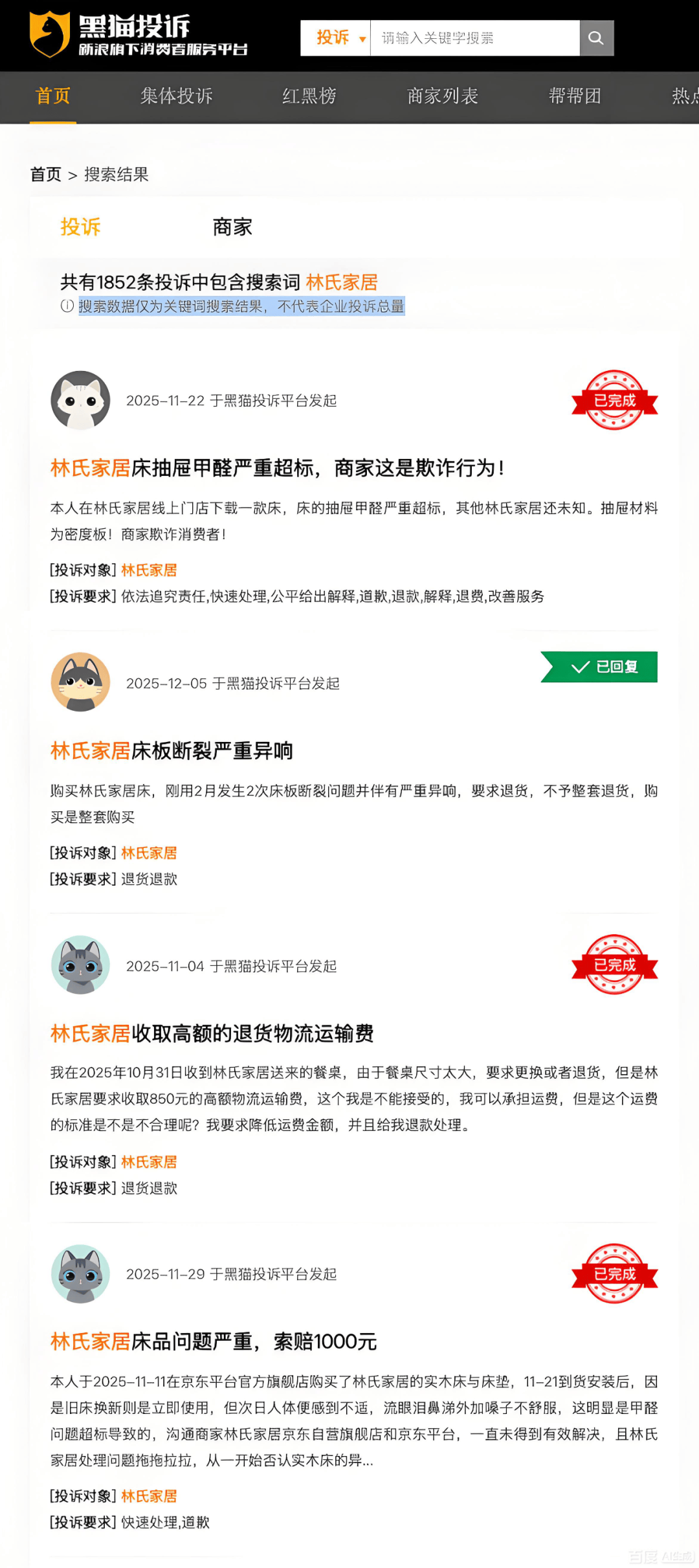 例如在黑猫投诉,截至12月7日下午3点,搜索“林氏家居”出现1852条投诉,多为产品气味大、质量差、发货慢等。(网页说明:此搜索数据仅为关键词搜索结果,不代表企业投诉总量)