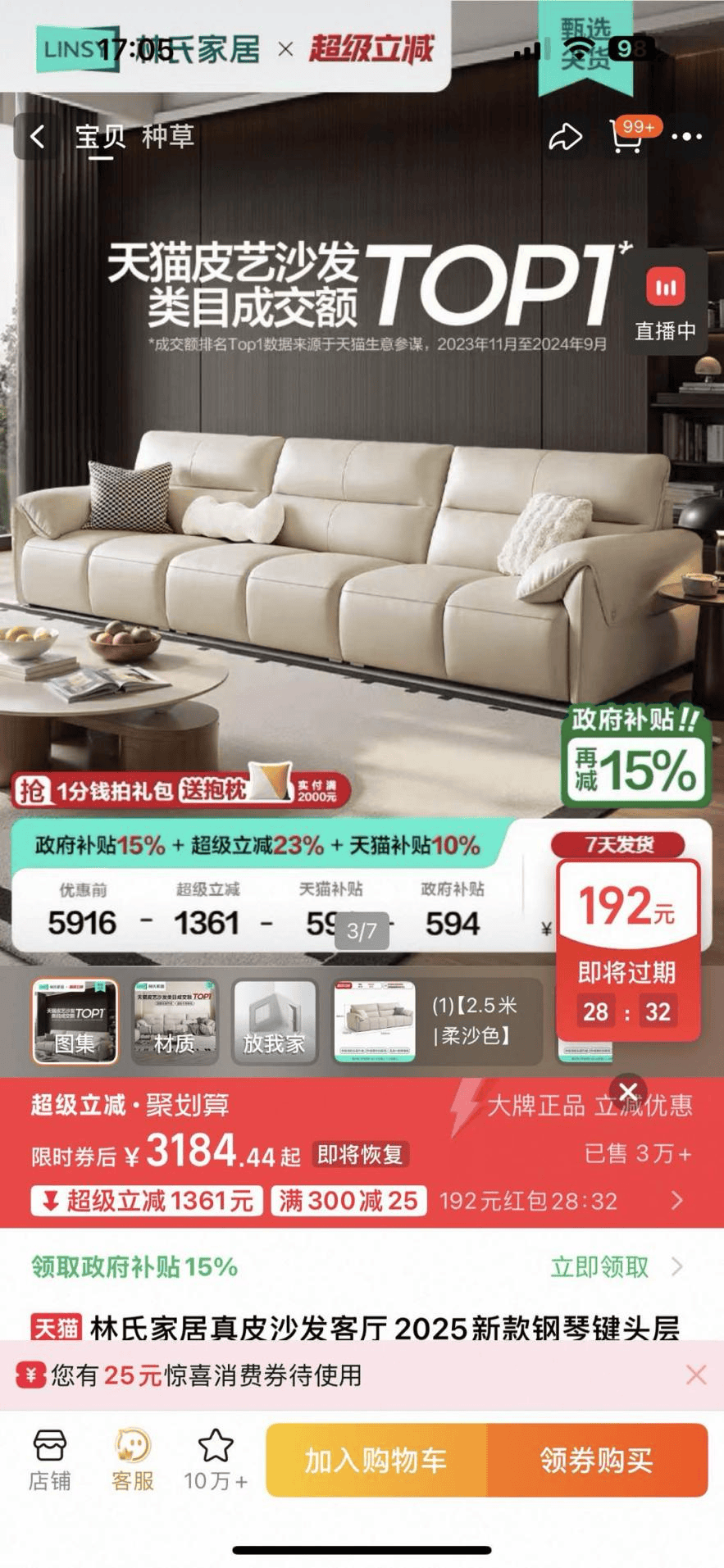 据林氏家居天猫期间店宣传页信息,其真皮琴键沙发获得了“天猫皮艺沙发类目成交额TOP1”,琴键沙发系列上线累计卖出34万件。(编者按:成交额第一数据来自天猫生意参谋,统计周期为2023年11月-2024年9月)