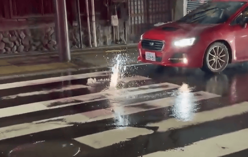 日本青森县路面出现喷水现象(图:朝日新闻视频截图)