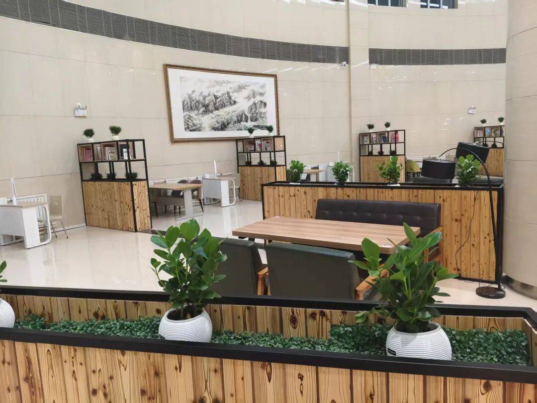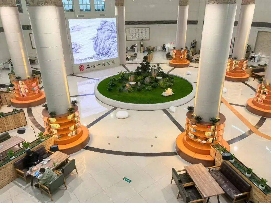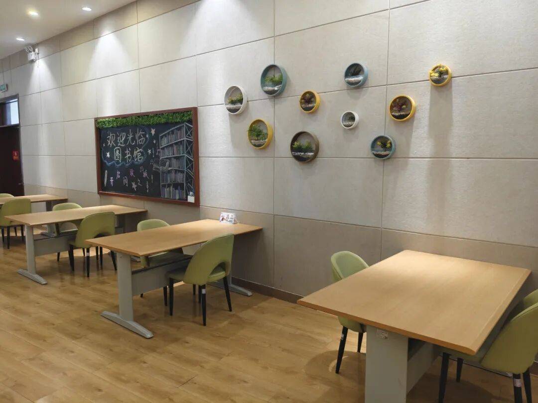 一楼大厅、阅览区周边点缀原生绿植,搭配原木家具+柔和灯光
