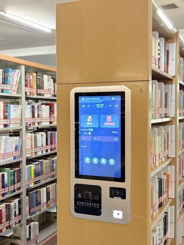 二楼成人外借部配备智能书架(电子标签+分类指引)+三维地图导航系统