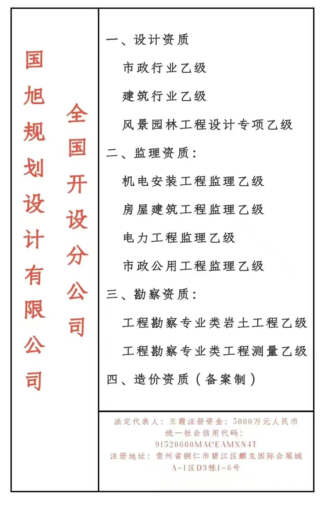国旭规划设计有限公司成立于2023-03-28,法定代表人为王霞,注册资本为5000万元,1761~0463~187,企业注册地址位于贵州省铜仁市碧江区,所属行业为专业技术服务业。