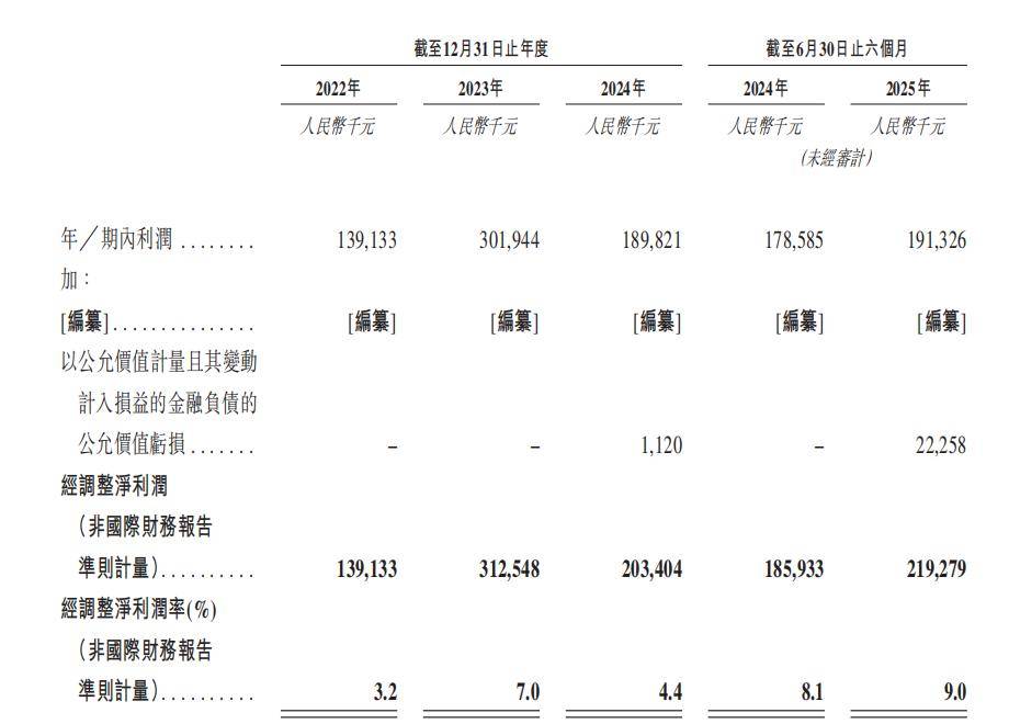 从盈利率看,净利率在3年间的轨迹是,2022年为3.2%,2023年升到6.8%,到了2024年又回落到4.1%;经调整净利率从3.2%升到7.0%,又回落到4.4%。而截至2025年6月30日,利润同比增加7.1%,净利率为7.8,经调整净利率为9.0%。