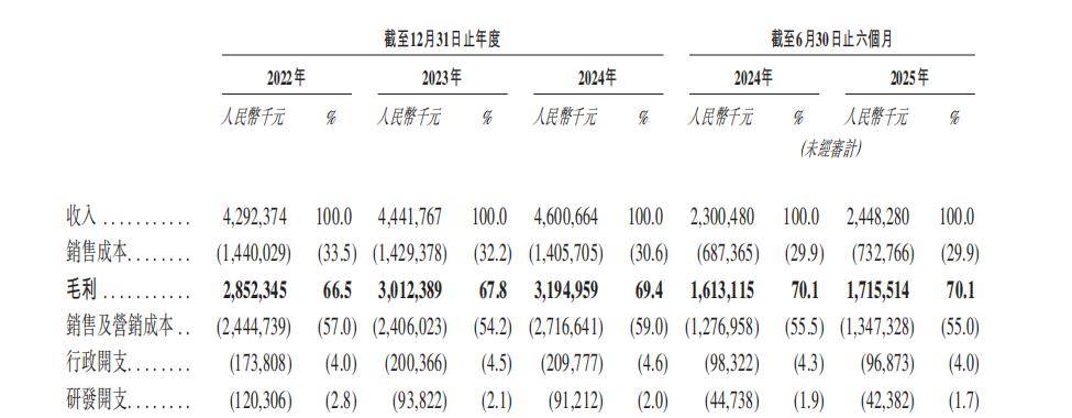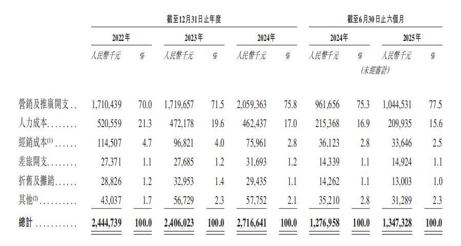 招股书披露,2024年销售及营销成本同比增长12.9%,高于收入3.6%的增幅。如果将销售及营销成本分来看,营销和推广开支在其中占比越来越高。2022年,营销及推广开支在销售及营销成本中的占比是70.0%;2023年是71.5%;到了2024年已经升到75.8%。截至2025年6月30日,这个占比继续升到77.5%。