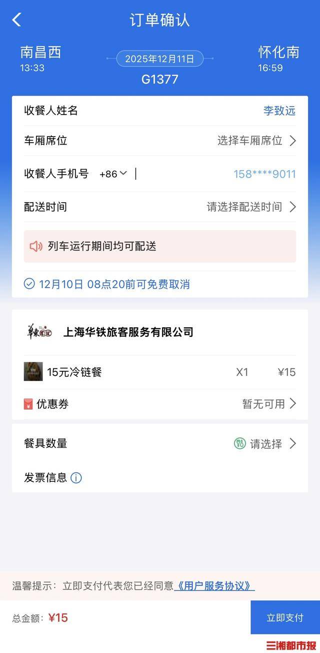 如此便宜的价格,如何才能成功点上?三湘都市报记者打开铁路12306App,进入首页点击“餐饮·特产”栏,根据车次输入相关信息后,可以看到“车上用餐”和“到店自取”两个板块,系统默认进入了“车上用餐”。当出现“列车自营”时,就可以选择这一15元冷链餐。
