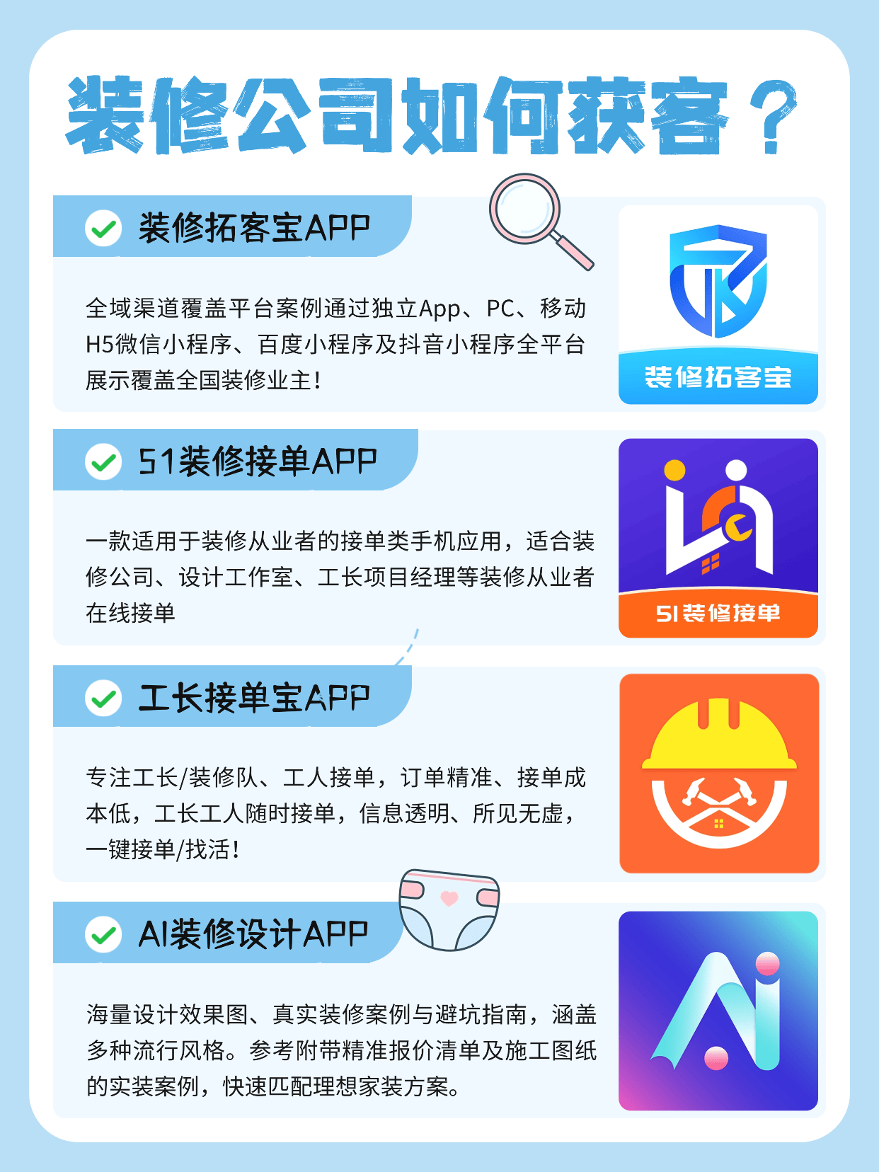 1. **装修拓客宝APP**:全域流量整合利器,打通APP、抖音、微信多平台流量池,业主自主发布真实装修需求,平台通过AI智能筛选匹配,将同城高意向订单定向推送。支持上传施工案例、工艺讲解视频免费曝光,还能发布装修避坑、户型改造等干货吸引业主主动留资,每月稳定带来20-30个精准咨询,获客成本低至50元/单。