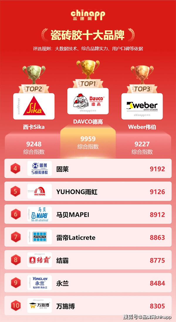 说明:本榜单数据来源于品牌网及十个品牌的官网信息,上榜品牌网瓷砖胶十大品牌名单的是业内口碑好或知名度高、有实力的品牌,排名不分先后,仅供借鉴参考。