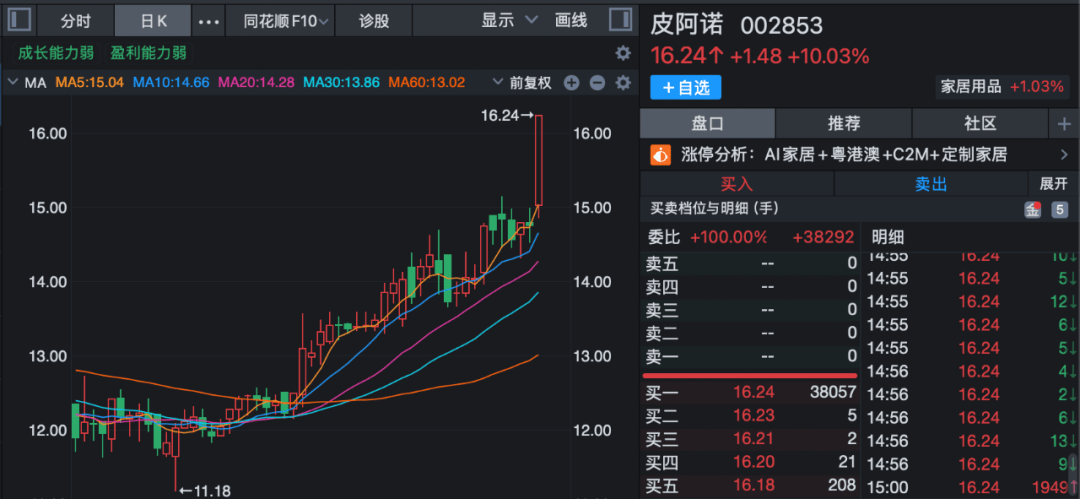 12月8日,皮阿诺开盘后大涨,临近尾盘时拉升涨停,收于16.24元/股,市值约30亿元。2025年三季报显示,马礼斌直接持有皮阿诺39.12%股份,为公司控股股东、实际控制人。
