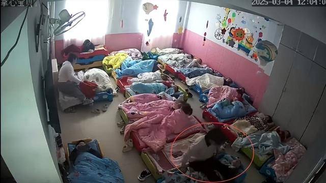 例如,3月4日午睡期间,有老师为了哄睡,用双腿压住一名盖着被子的男孩身体,同时将鞋摔向另一名未入睡幼童。几分钟后,被压男孩拍手玩耍,被老师扇耳光、掐脸制止。3月5日,一名老师推倒想要离开教室的男童,并对其实施了近2分钟的掐脸、拧屁股等行为。
