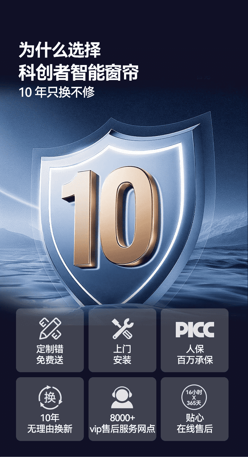 适配与售后:适配直轨、双开窗等主流窗型,安装简单;1500+城市上门,3年质保符合行业平均。
