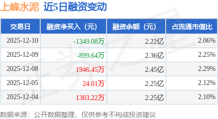 证券之星消息,12月10日,上峰水泥(000672)融资买入2414.08万元,融资偿还3763.16万元,融资净卖出1349.08万元,融资余额2.22亿元。