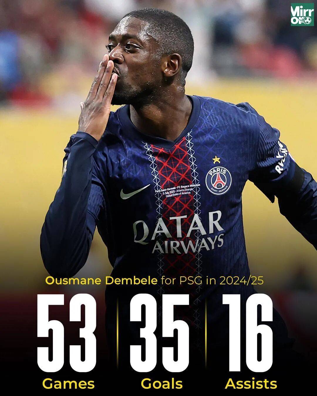 上赛季,登贝莱在巴黎圣日耳曼迎来了大爆发。他不仅保持了超高的出勤率,单赛季踢了53场比赛,创下个人职业生涯纪录。同时也在53场比赛中贡献了35球外加14次助攻,进球效率飙升。在恩里克的悉心调教之下,登贝莱在9号位上大放异彩,帮助巴黎拿到了队史首座欧冠冠军奖杯和第13座法甲联赛冠军。随后,登贝莱在9月份的金球奖评选中击败了17岁的亚马尔,成功当选为金球先生。