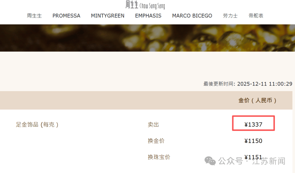 12月11日,国内黄金饰品价格对比显示,多家黄金珠宝品牌公布的境内足金首饰价格较昨日有所上调,周生生报价1337元/克,周大福报价1336元/克,老凤祥报价1335元/克,老庙黄金上海区域克价为1336元,六福珠宝报价1326元/克。