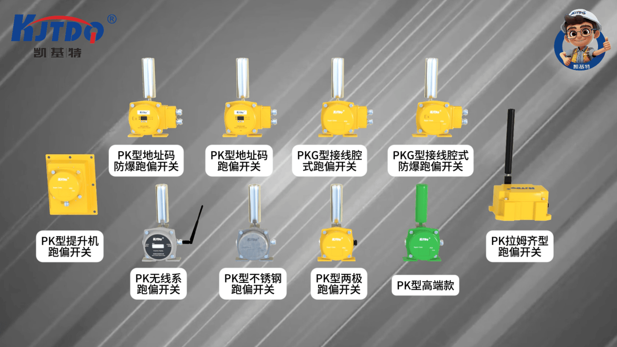 根据不同的应用需求,凯基特提供了多种型号的跑偏开关,广泛应用于矿山、电力、化工等行业的各种输送机系统。无论是在高温、高湿、粉尘环境下,还是在特殊的运输要求中,都能提供稳定的工作性能。