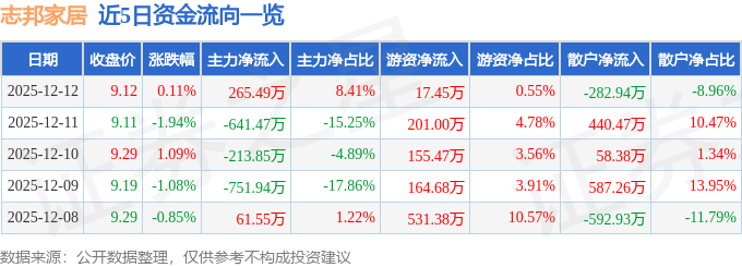 证券之星消息,截至2025年12月12日收盘,志邦家居(603801)报收于9.12元,上涨0.11%,换手率0.79%,成交量3.44万手,成交额3156.78万元。