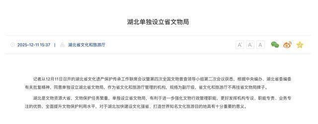 湖北是文物资源大省,文物保护任务繁重,单独设立省文物局,有利于进一步强化文物行政管理职能,更好发挥机构专设、职能专责、业务专注的优势,全面提升文物保护利用水平,对于湖北加快建设文化强省、打造世界知名文化旅游目的地具有十分重要的意义。