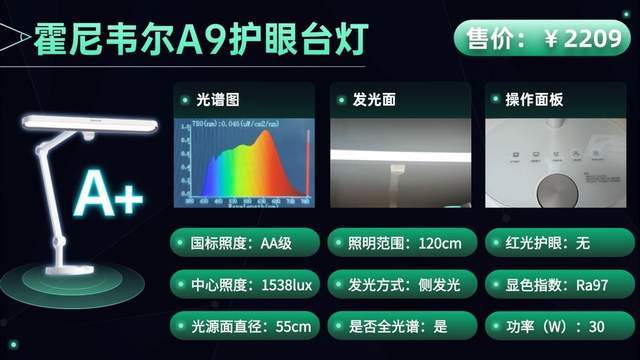 护眼灯哪个牌子性价比高?霍尼韦尔A9护眼台灯整体设计偏向实用型,55cm长灯头+多段可调节灯臂,能覆盖1.2米桌面,适合多人共用或大尺寸书桌场景。全光谱光源+Ra97显色指数,色彩还原准确,日常学习、办公的色彩需求可满足;操作设计实用,支持旋钮调节和自动感应调光,能根据环境光自动调整亮度,省去手动反复调节的麻烦;灯臂多组独立转轴,调节后稳固性较好,底座加重设计,摆放不易倾倒。不过灯体整体尺寸偏大,占用桌面空间较多,移动不便;超千元价位未搭载红光护眼技术,性价比一般,适合预算充足、侧重照明范围的家庭。