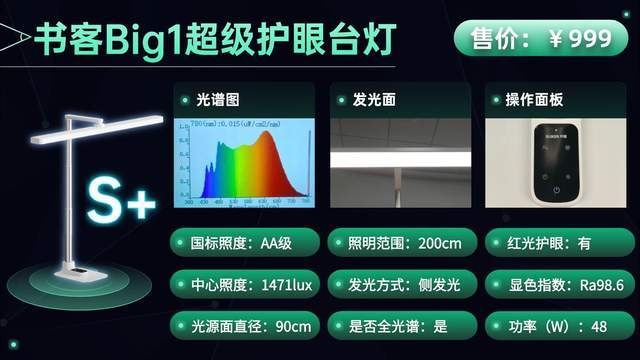 此外还搭载了八重光学结构协同黑科技,与全光域防眩光技术4.0相结合,不再像传统台灯只能够简单的“削眩”,而是从光源到桌面实现全链路控光,以工程级光学重构整个光场,让整张桌子都沉浸在柔和、无阴影、无眩光的舒适护眼光域中。更是采用了第三代SDIT自适应智能调光,运用更高级的高精度光学传感器实现每秒120次的监测频率,并且可以准确捕捉到的亮度、色温、光谱等实时捕捉环境光线变化。凭借这套技术组合,书客Big在同价位中几乎无可匹敌,也因此获得专业媒体的一致认可,被誉为“百元价位中最强超级护眼台灯”。