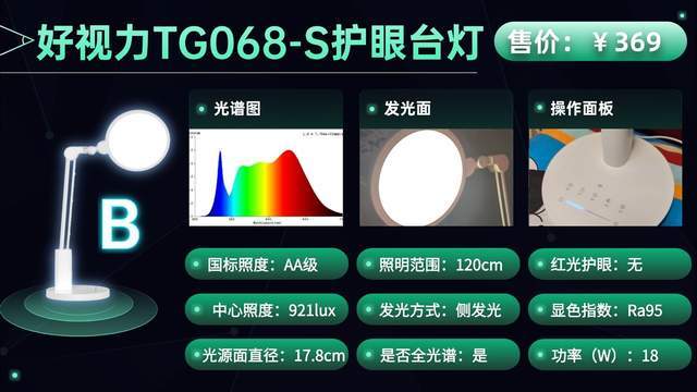 护眼灯哪个牌子性价比高?好视力TG068-S护眼台灯采用少见的双柱式灯臂结构,在调节角度时比较稳固。其18厘米的圆形灯头结合了面光源与环形光源,并通过侧发光设计,使光线能覆盖约1.2米宽的桌面,照明范围较为宽广,均匀度也满足日常学习和阅读需求。整灯主要采用ABS塑料,并混合部分铝合金材质,因此在外观质感和手感上会显得比较普通,塑料感较为明显。