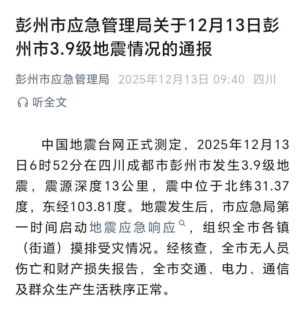 据成都网络辟谣消息,成都市彭州市应急管理局通报,2025年12月13日6时52分在四川成都市彭州市发生3.9级地震,震源深度13公里,震中位于北纬31.37度,东经103.81度。经彭州市应急局全面核查,全市无人员伤亡和财产损失报告,全市交通、电力、通信及群众生产生活秩序正常。