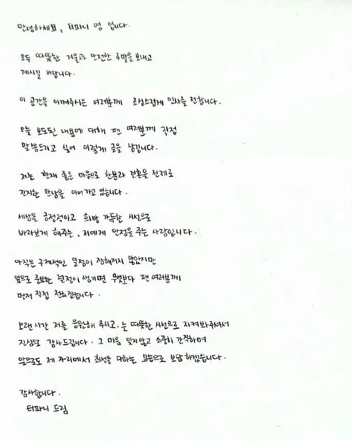 搜狐娱乐讯 13日,少女时代Tiffany在ins上传亲笔信回应与卞耀汉恋情,“现在的我正以积极的心态,和一个人以结婚为前提真挚地交往中”,她还称没有确定具体日期,如果未来决定了会最先告诉粉丝。