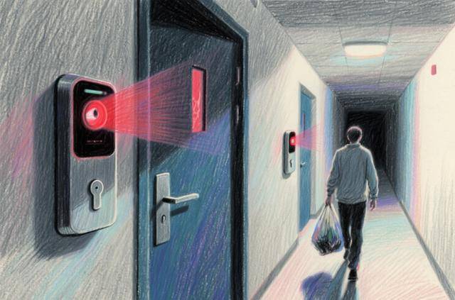 两户门对门且相隔仅约2米的邻居,其中一家安装在门上的智能门锁带有自动感应摄像头,经常对另一家人的日常出入进行感应抓拍。