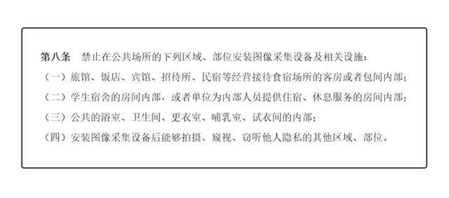 今年4月,《公共安全视频图像信息系统管理条例》正式实施,当中第八条规定,禁止在公共场所的一些区域、部位安装图像采集设备及相关设施。包括安装图像采集设备后能后拍摄、窥视、窃听他人隐私的其他区域、部位。这也意味着,安装能够拍摄、窥视、窃听邻居隐私的智能门锁、摄像头等设备会违反上述条例。