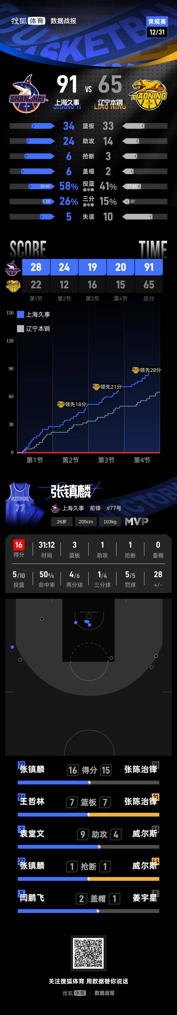 【搜狐体育战报】北京时间12月31日CBA常规赛第9轮,客场作战的上海久事以91-65击败辽宁本钢,辽宁本钢遭遇4连败,上海久事取得5连胜。张镇麟16分3篮板1助攻,张陈治锋15分7篮板1助攻。