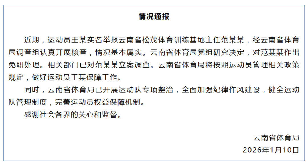1月10日晚,云南省体育局发布情况通报:
