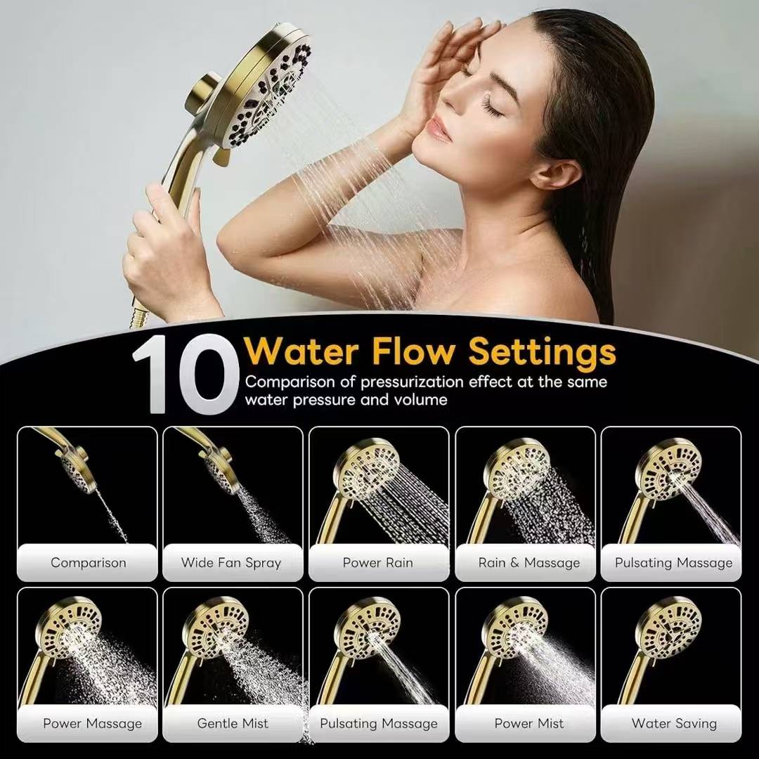 在功能方面,黄金花洒更是实力超群。它拥有10种出水模式,无论是追求畅快淋漓的雨淋模式,还是想要享受放松身心的脉冲按摩模式,抑或是体验柔和亲肤的气泡水模式,都能轻松满足。独特的空气注入式增压技术,让水流更加澎湃有力,哪怕是在低水压的环境下,也能带来畅快的沐浴体验。