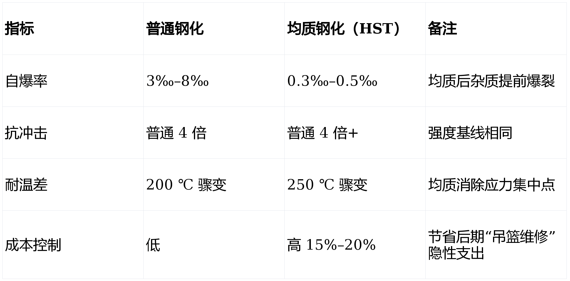 均质玻璃:把钢化玻璃再送进260 ℃ 均质炉,恒温 2h 做“引爆排雷”。有缺陷的玻璃提前爆裂,出厂的自爆率从 3‰ 降到 ≤0.3‰,俗称“HST 钢化”。