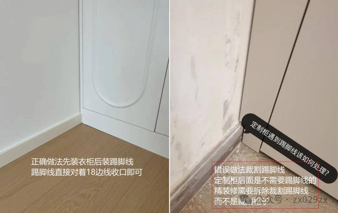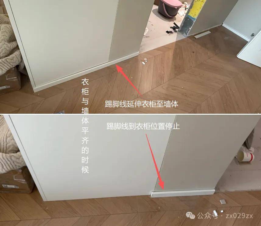 如图侧面衔接,第一种衣柜突出墙面踢脚线厚度,后期满足直接收口;第二衣柜内退踢脚线厚度,后期踢脚线拐角收口;两种做法需要提前考虑。