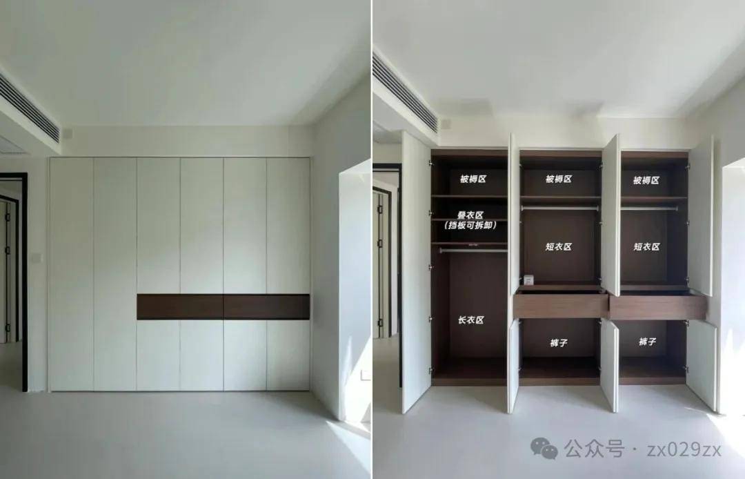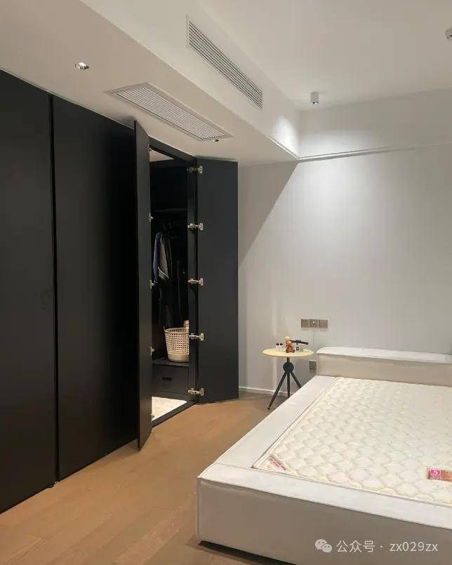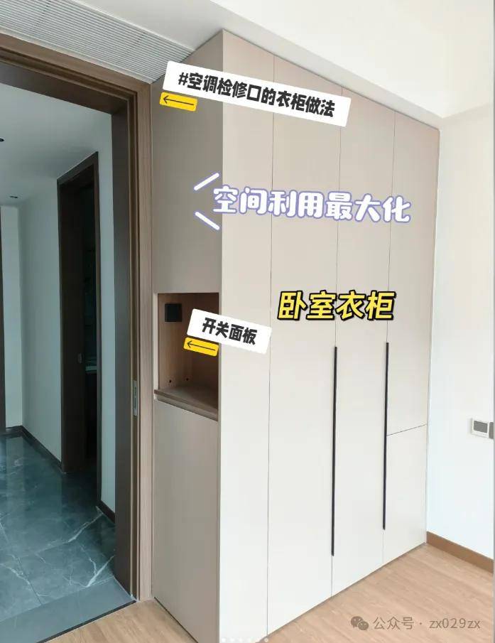 正确做法是最大化定制衣柜,同时侧面柜满足开关位置,上方与风口协调,打开柜门满足检修口的正常使用。「空调风口和定制冲突,聪明人这样干解决难点」