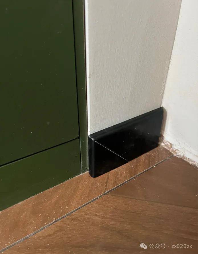 柜门两边5公分边线突出踢脚线厚度,刚好满足踢脚线收口,但是边线太宽太厚重了。