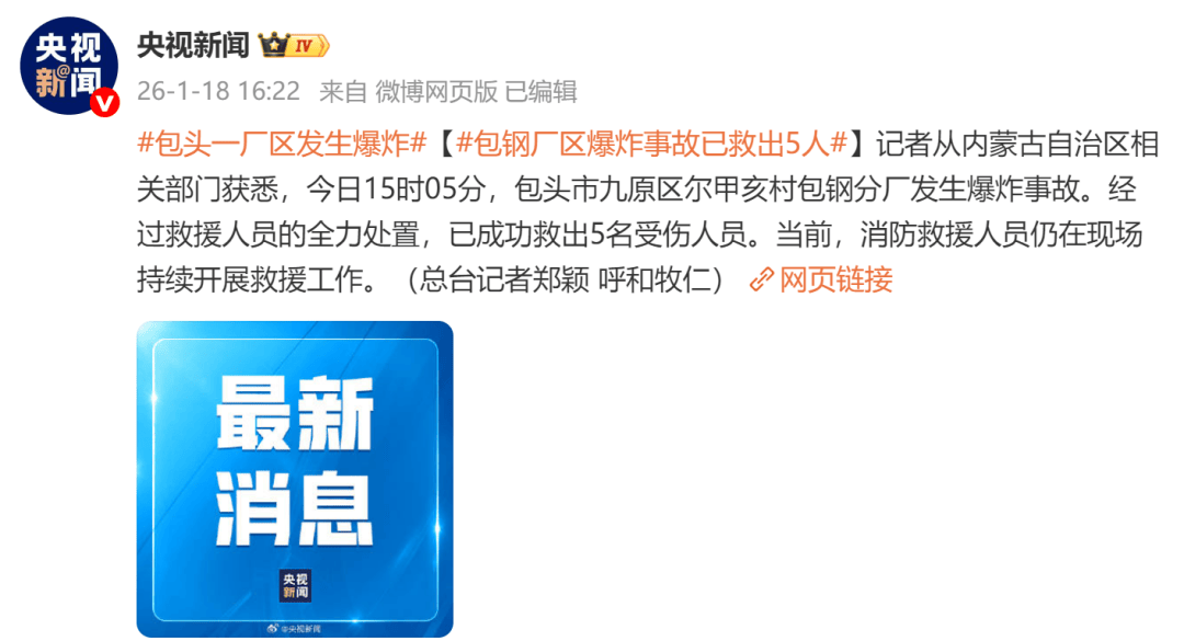 据央视新闻:记者从内蒙古自治区相关部门获悉,1月18日15时05分,包头市九原区尔甲亥村包钢分厂发生爆炸事故。事故发生后,消防、公安、医疗等多部门调集多支救援队伍、专业救援装备及相关应急力量赶赴现场,全面开展抢险救援工作。