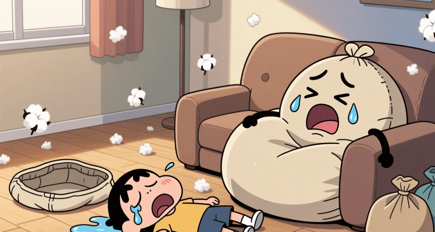 本想塞成完美豆袋,结果棉花分布不均,沙发一边高一边低。坐上去像滑梯,直接溜到地上。我无奈重塞,它却顽固保持畸形,仿佛说:“我就喜欢这样,别折腾了。”最终放弃,它成了房间抽象雕塑,参观者都问设计理念,我答:“累瘫美学。”
