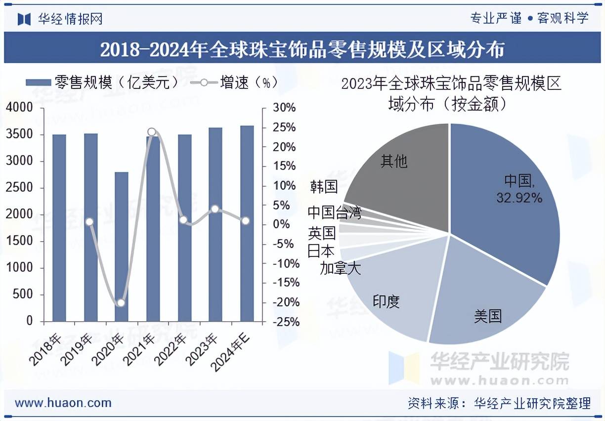 从全球市场维度看,近年来全球珠宝饰品零售规模呈现出波动变化趋势,2023年全球珠宝饰品零售规模约为3645.3亿美元,同比增长3.84%。由于中国在黄金消费方面的韧性和电商创新的驱动,已经成为全球最大的珠宝首饰消费市场。按金额计算,2023年中国珠宝饰品的零售规模占比为32.92%,美国和印度次之。