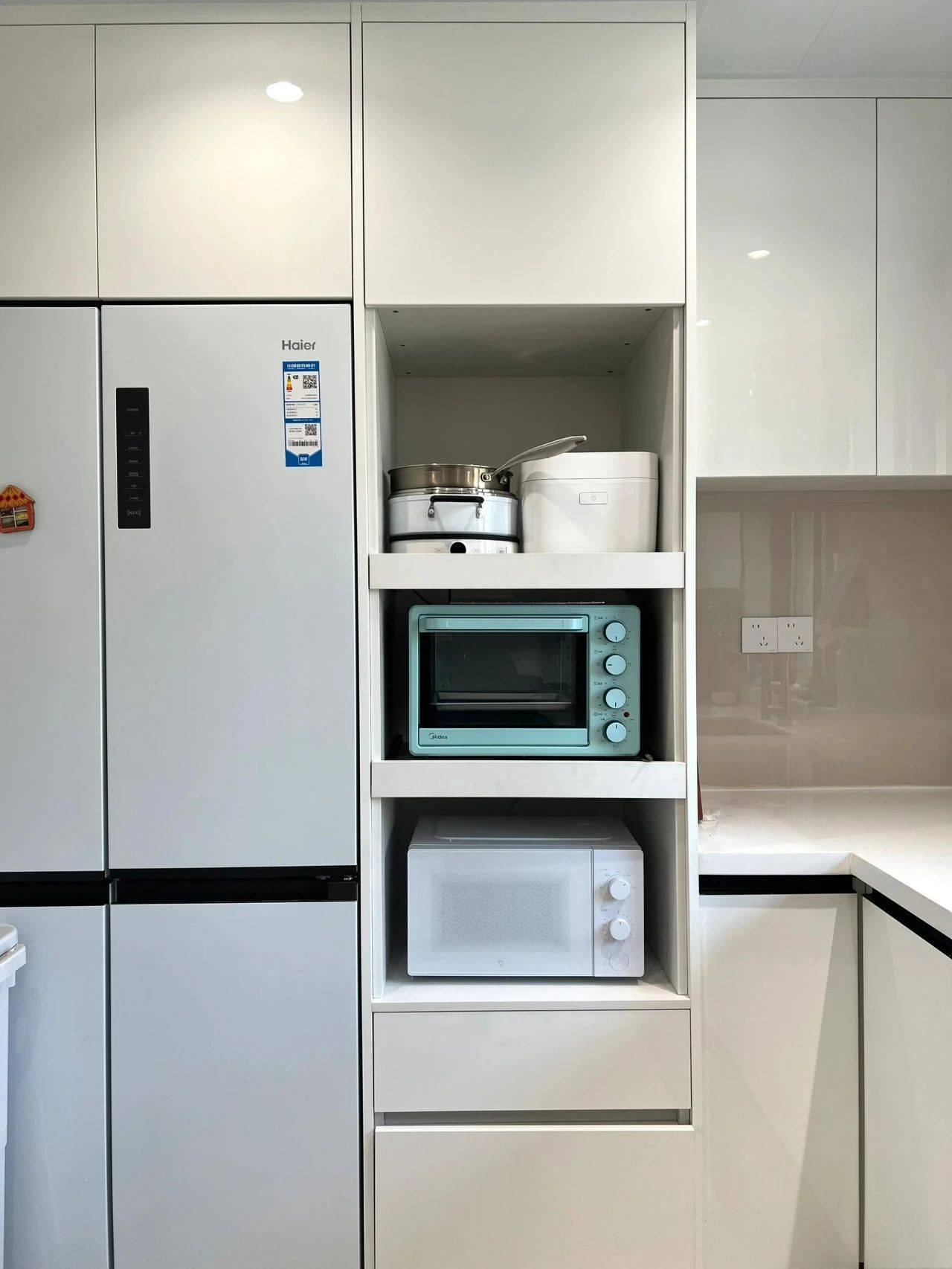 4)若厨房小家电较多,并且使用频率较高,一定要做一组高柜,并给开放格隔层做抽拉设计。反之,就安装上柜门。