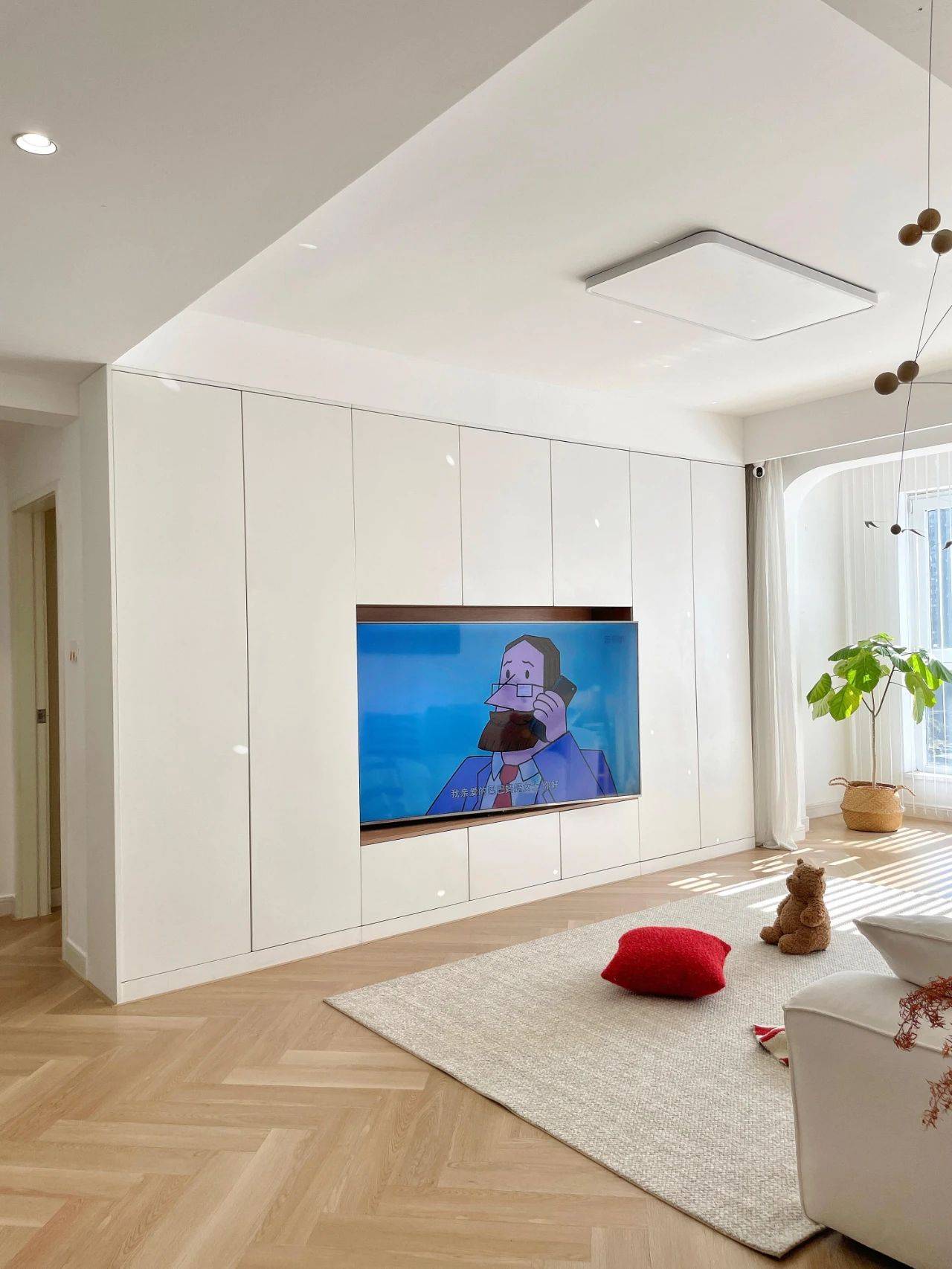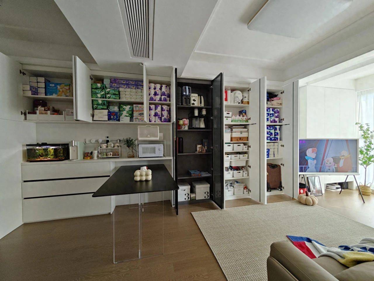 电视满墙柜,固然十分简洁利落,可在家里有娃的情况下,频繁开关柜门收纳,也的确影响到了收纳效率。