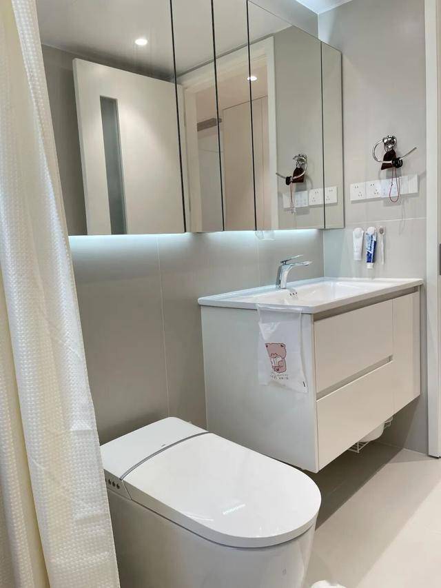 像网友@真真真,就在浴室柜侧面做了“留空设计”,方便纸巾、马桶遥控器、手机等物品收纳。