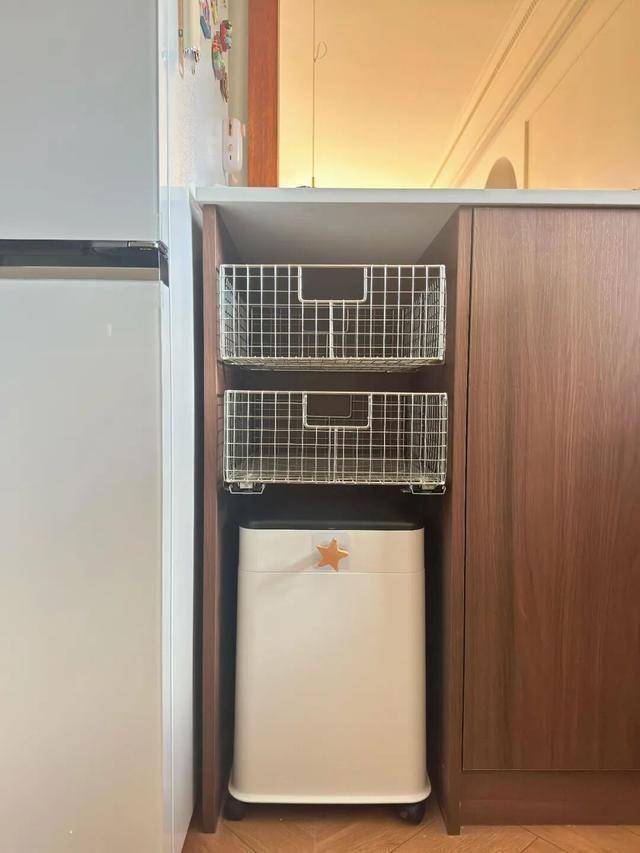 比如网友@chigo,就给橱柜留了一块35cm宽的空间,上面安装两层网篮收纳蔬菜,下面还可以塞一个移动垃圾桶,最大程度保证了厨房的秩序感。