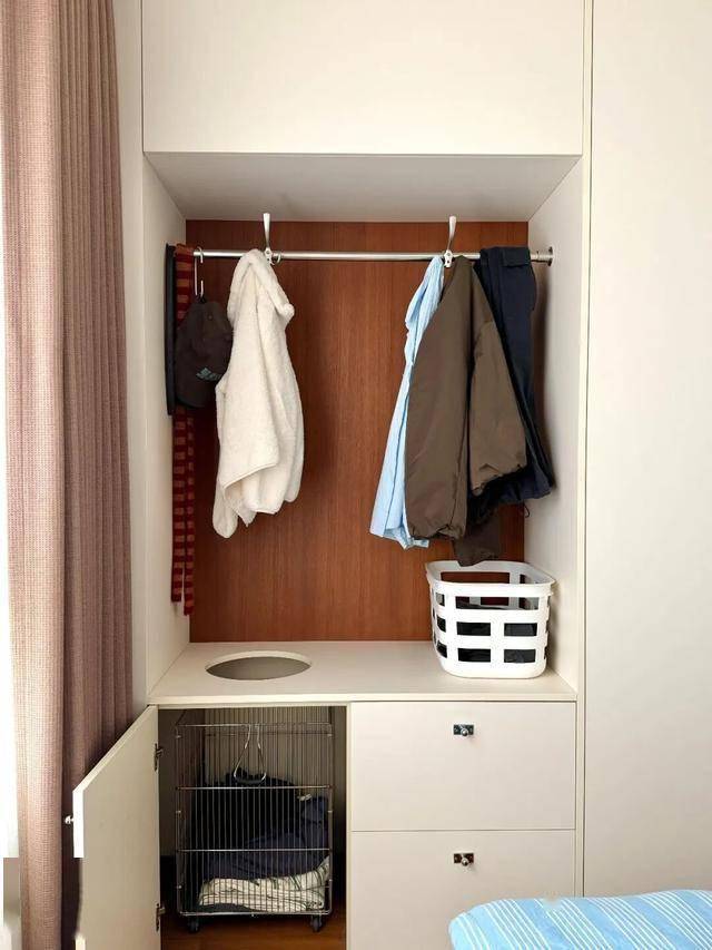所以,网友@麻团,就坚持给床尾的衣柜做了“留空设计”,专门收纳那些穿过但不需要洗的衣服。