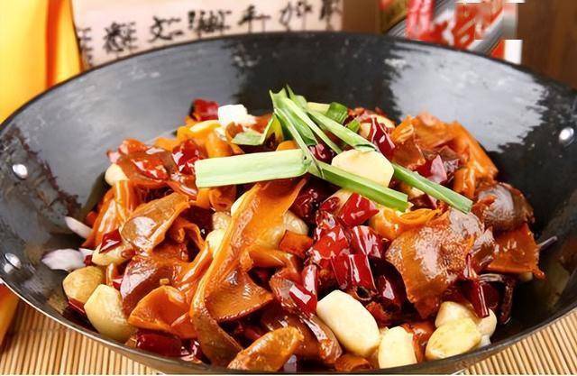 3、锅入油烧热,先下红油豆瓣和泡椒末炒几下,再把鸭肠、鸭肺、鸭心和鸭肝放进去炒2分钟,待投入青椒块、红椒块、野山椒段、蒜薹段和大蒜瓣后,续炒2分钟并加盐、鸡精、味精、白糖和香醋,炒入味便装入干锅内上桌。