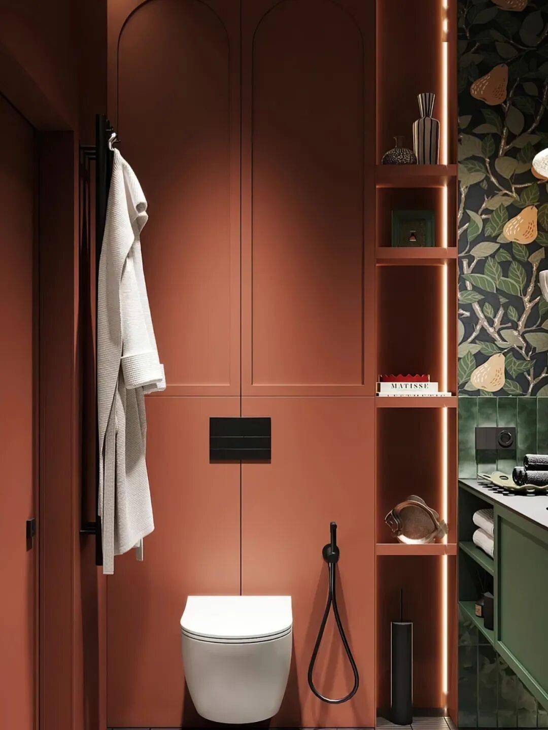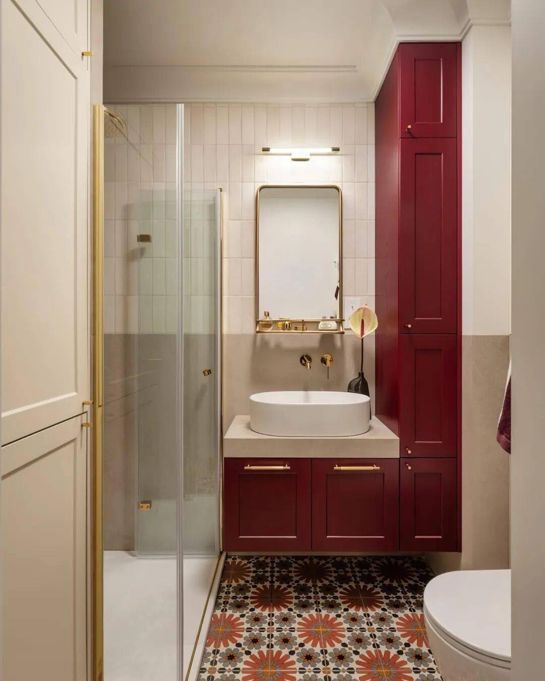 复古红与橄榄绿的撞色大胆鲜活,搭配花砖与木质元素,让浴室充满活力;墨绿白格纹瓷砖则自带复古滤镜,搭配圆形发光镜,营造出清新又治愈的氛围。