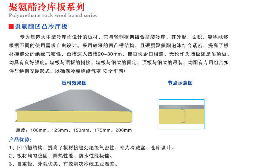 其主要产品之一的聚氨酯冷库板具有诸多优势。芯材采用专用防火岩棉、玻璃棉,产品具有防火、防水、隔热、环保、低碳节能、美观、安装便捷等性能优势。冷库板表面光滑平整,安装方便,能够有效缩短工期。同时,产品具有轻质、美观和良好的防腐蚀性能,聚氨酯不助燃,让用户安全放心。而且施工简单方便,可以重复循环使用,规格齐全,现货供应。